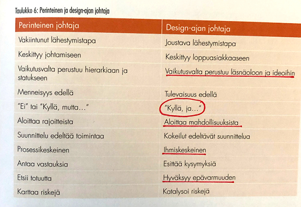 Erityisen hyvää kirjassa on minusta hyvin käytännönläheiset osiot siitä, miten design-lähtöinen organisaatio rakennetaan ja miten sitä johdetaan, ja miten se eroaa perinteisestä tavasta. Design-lähtöinen johtajuus tarkoittaa suuria muutoksia siihen tapaan, jolla esimerkiksi Suomessa perinteisesti ja tyypillisesti johtajien odotetaan toimivan.
